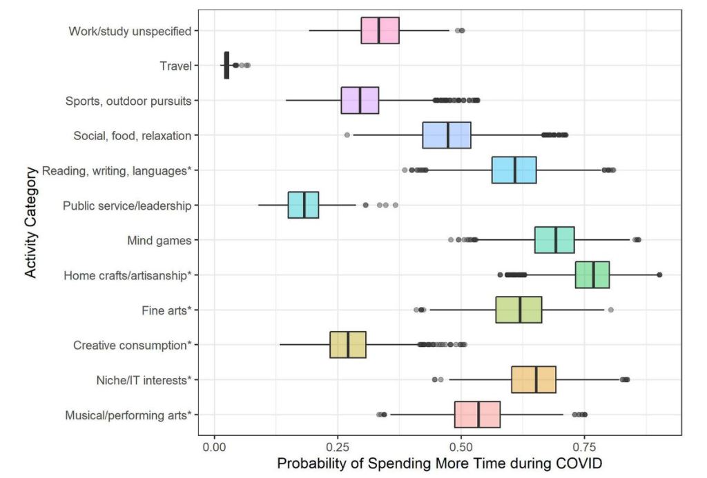 When it came to the 12 categories, we found that creative activities were really popular in lockdown. In fact, time spent on certain types of creative activities — specifically reading and writing activities, home crafts, fine arts, niche/IT interests, and musical and performing arts — was significantly more likely to increase than time spent on physical activity. You can see this set out in the graph below, taken from our paper (creative activities marked with *). In fact, when creative activities as a whole are compared to non-creative (including sports and exercise), individuals were more than twice as likely to increase time spent on creative activities.