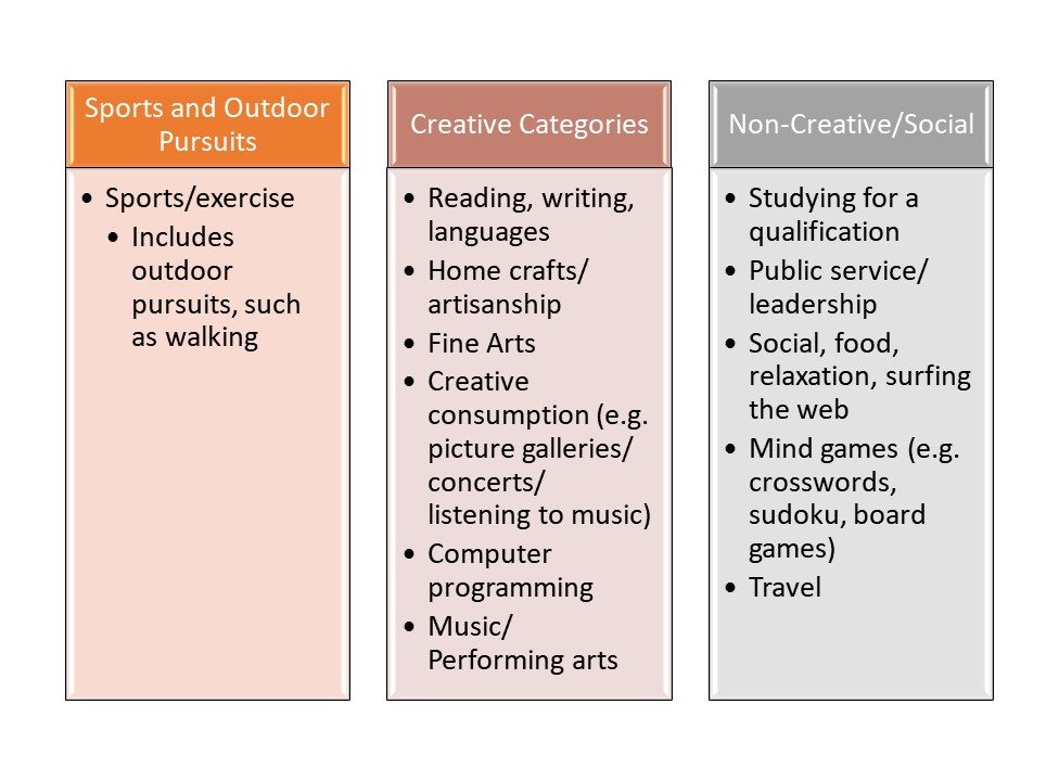 12 categories of leisure activities, divided into creative, non-creative and sporting groups