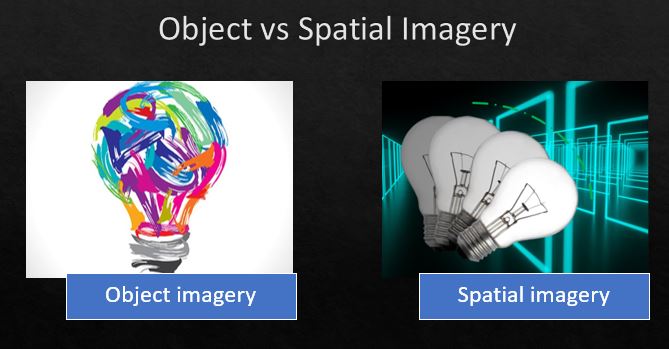 In the first place, VIV is interpreted in the VVIQ as unidimensional – that is to say that it is measured as one quality (how dynamic, vigorous and alive the image is). But we know from work by Blazhenkova & Kozhevnikov that this isn’t the full picture, and that mental imagery uses two different pathways in the brain: ‘what’ and ‘where’.