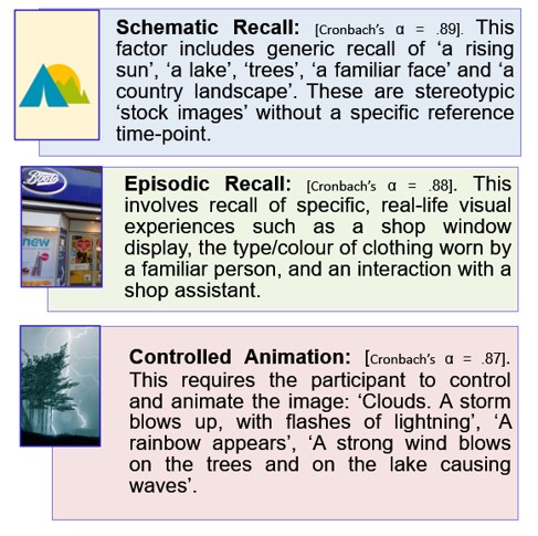 Although the imagery required by the VVIQ is pretty mundane (proximal) in nature, it does seem to embrace a range of styles of imagery. For example, some items seem to require only sketchy recall (imagine the sun rising; the colour and shape of trees); while others seem to require clear episodic recall (recall a shop you visit often); and yet others seem to demand the ability to animate the scene (a storm blows up with thunder and lightning). We suspected that the VVIQ was in fact testing three of the factors we identified in our model: schematic recall of very basic forms; episodic recall of specific events in our lives; and mental rotation/controlled animation of everyday scenes.